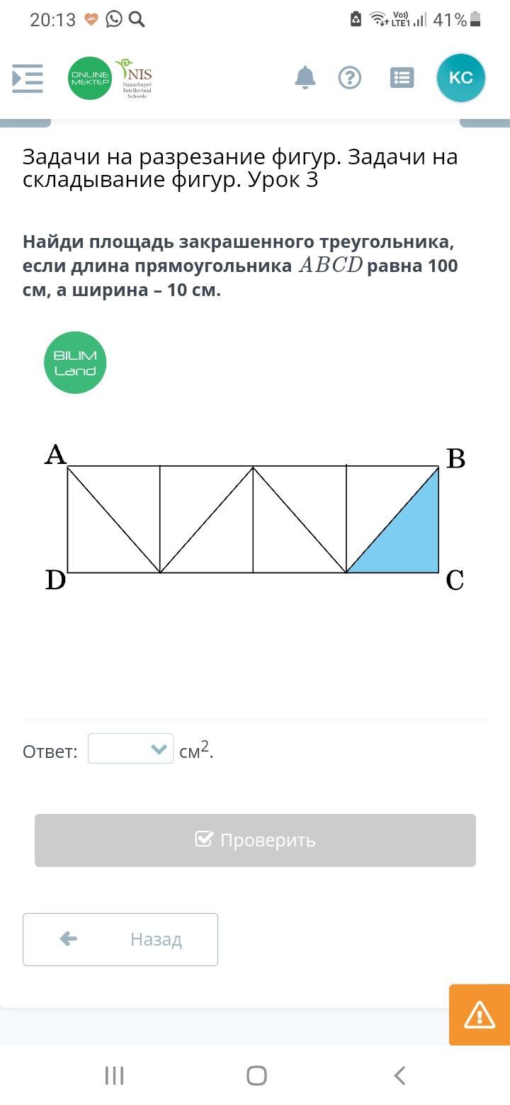 Найди площадь закрашенного треугольника, если длина прямоугольника ABCD равна 100 см, а ширина – 10 см.