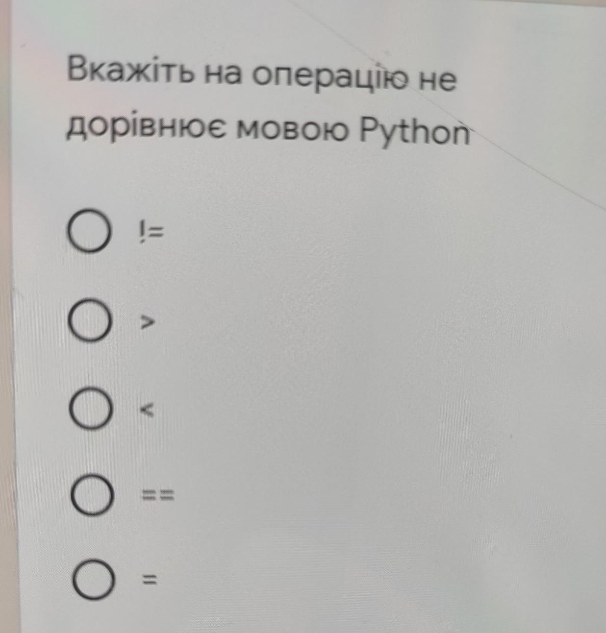 Вкажіть на операцію не дорівнює мовою Python