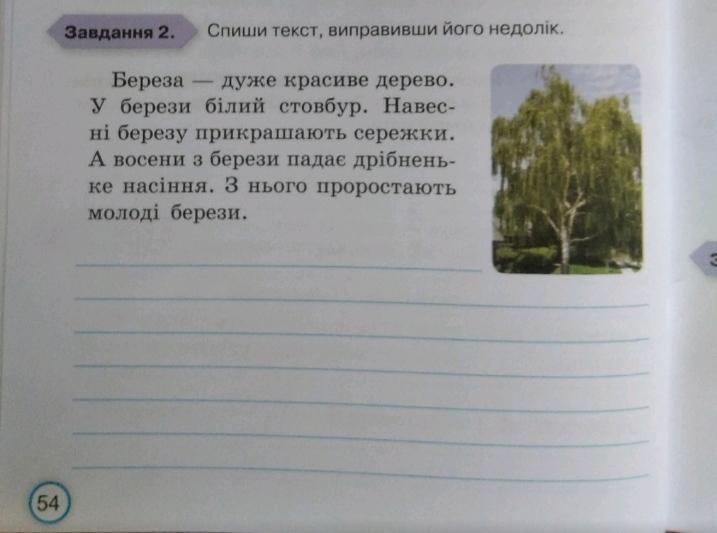 Береза-дуже красиве дерево. В неї білий стовбур. Навесні дерево прикрашають сережки. А восени з неї падає дрібненькі насіння. З нього проростають молоді берези.