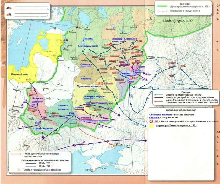 обведите общую границу русских земель в 1236 году обозначьте стрелками основные направления шествие монголов на Русь в 1236 году по 1238 год 1236 год 1238 год подпишите названия центров русских земель подпишите названия государств соседей Руси