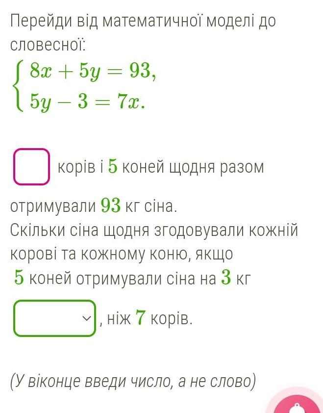 8 корів і 5 коней щодня разом отримували 93 кг сіна. Скільки сіна щодня згодовували кожній корові та кожному коню, якщо 5 коней отримували сіна на 3 кг менше, ніж сім конів.