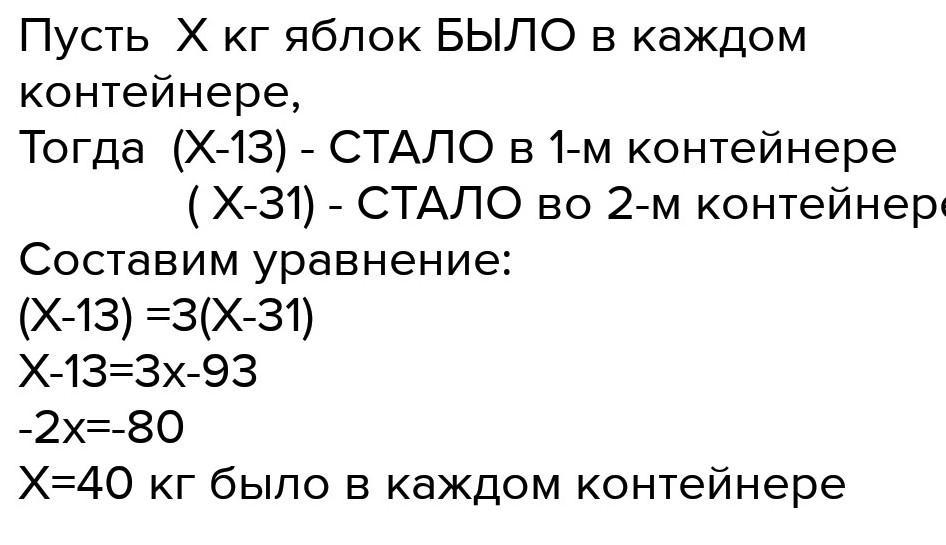 4 В двух контейнерах было поровну яблок. Когда из первого контейнера взяли 13кг яблок, а из второго - 31 кг, то во втором контейнере осталось в 3 раза меньше яблок, чем в первом. Сколько килограммов яблок было в каждом контейнере вначале?