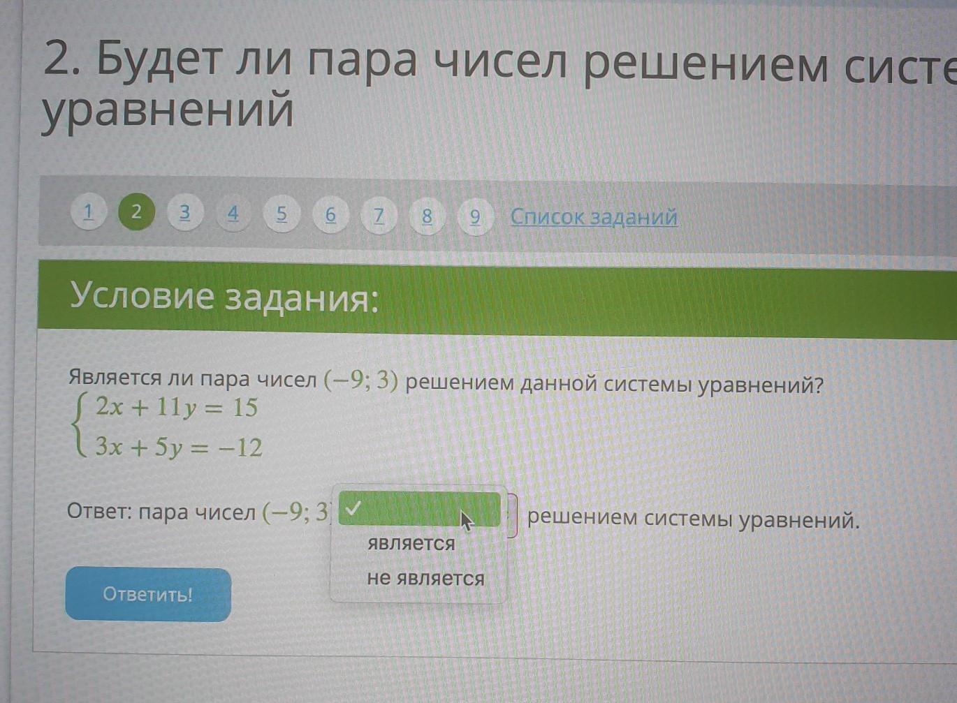 Ответ: пара чисел (-9;3) является решением системы уравнений