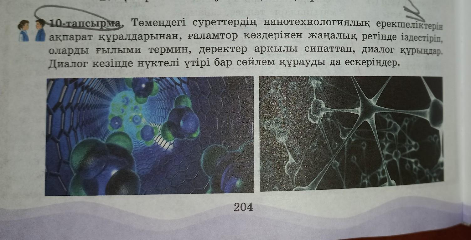 10-тапсырма. Төмендегі суреттердің нанотехнологиялық ерекшеліктерін ақпарат құралдарынан, ғаламтор көздерінен жаңалық ретінде іздестіріп , оларды ғылыми термин, деректер арқылы сипаттап, диалог құрыңдар. Диалог кезінде нүктелі үтірі бар сөйлем құрауды да ескеріңдер.