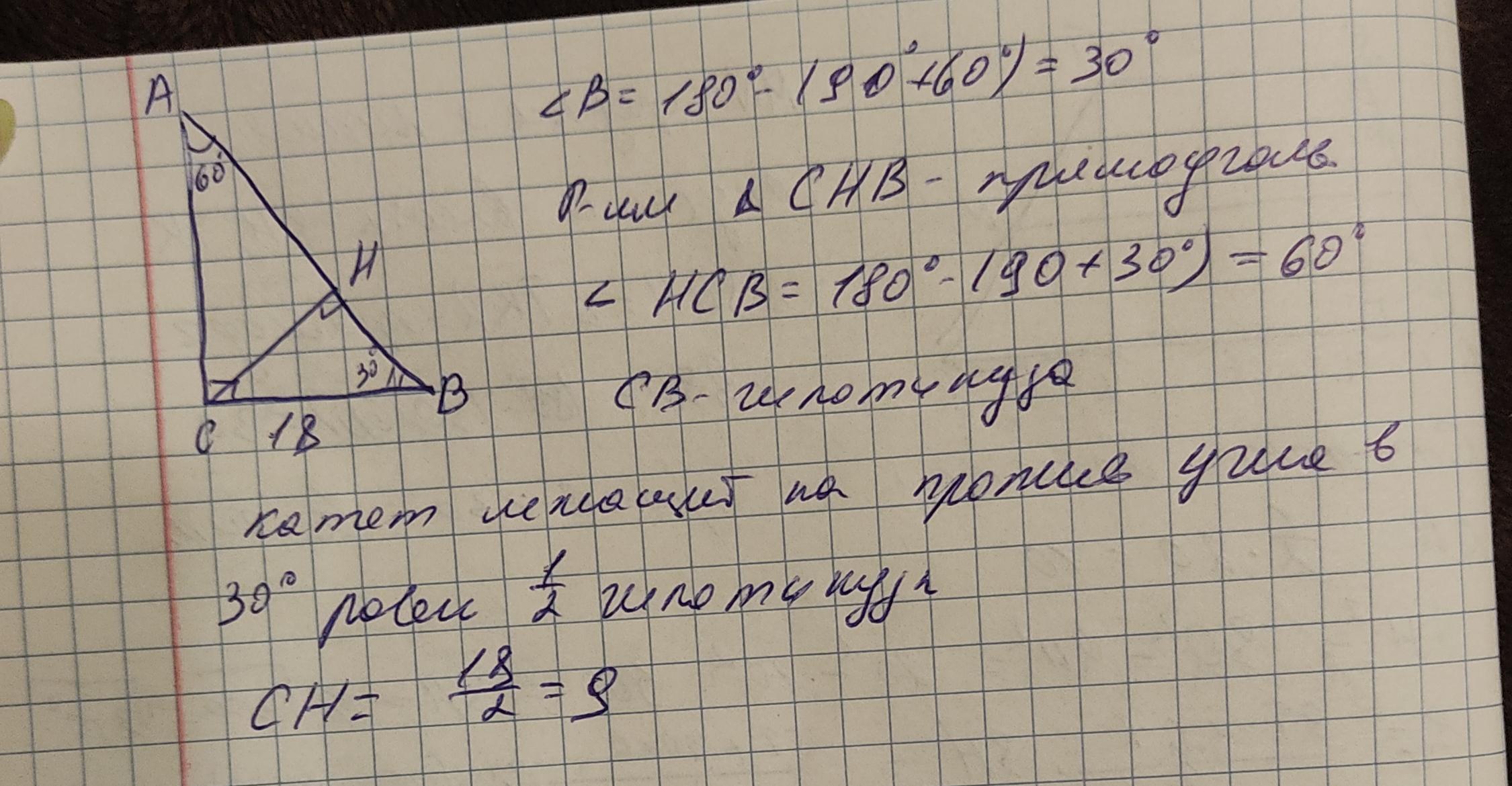 в прямоугольном треугольнике ABC угол C равен 90° угол А равен 60 градусам катет CB равен 18 дм Найдите высоту CЕ