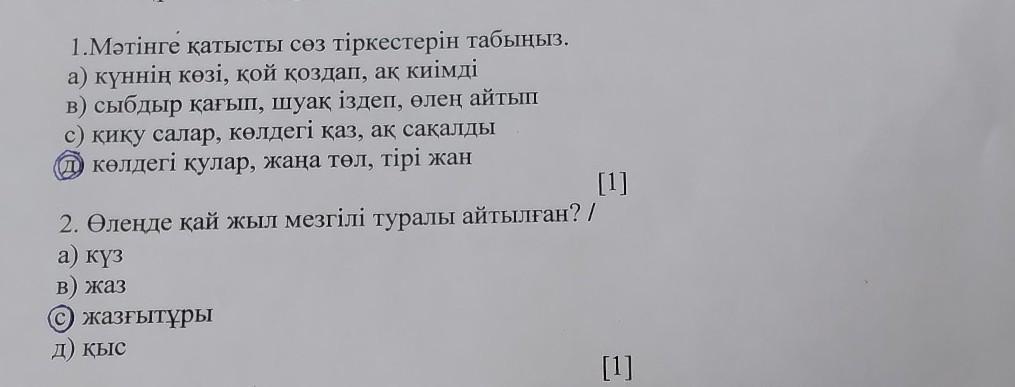 1.Мәтінге қатысты сөз тіркестерін табыңыз. а) күннің көзі, қой қоздап, ақ киімді в) сыбдыр қағып, шуақ іздеп, өлең айтып с) қиқу салар, көлдегі қаз, ақ сақалды Д) көлдегі қулар, жаңа төл, тірі жан [1] 2. Өлеңде қай жыл мезгілі туралы айтылған? / а) күз в) жаз С) жазғытұры д) қыс [1] iлго прыс ақпаратты ажыратыңыз.