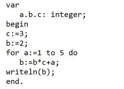var a.b.c: integer; begin c:=3; b:=2; for a:=1 to 5 do b:=b*c+a; writeln(b); end. Пожалуйста помогите решить до завтра до 11:00.