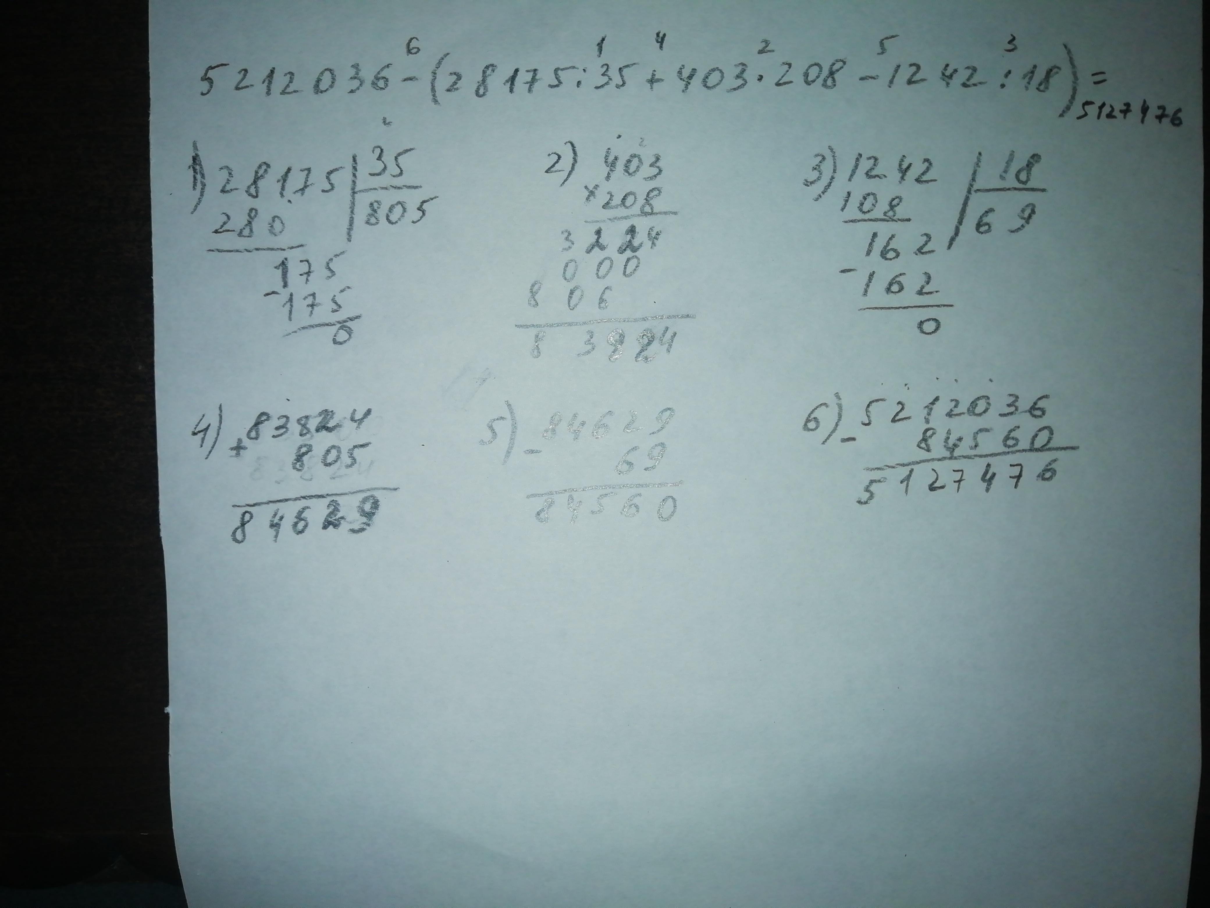 РАБОТА В ПАРЕ 4. Определи порядок действий и вычисли значения выра- жений. -- 5 212 036 - (28 175: 35 + 403 · 208 - 1242:18). 7 897 744 : 472 +251 · 84 - (69.391 – 66 112: 8) 87 613 + 665 760: 95 + 103 · (500 200 - 469 937) .бж в столбик