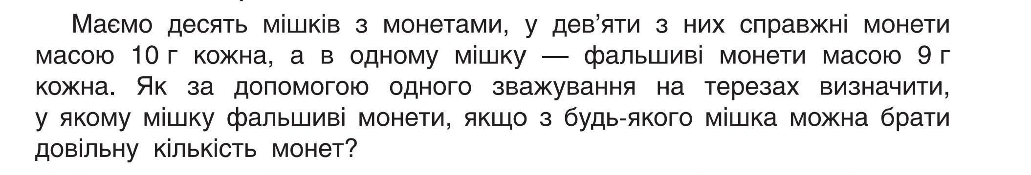 Маємо десять мішків з монетами, у дев'яти з них справжні монети масою 10 г кожна, а в одному мішку фальшиві монети масою 9г Кожна. Як за допомогою одного зважування на терезах визначити, у якому мішку фальшиві монети, якщо з будь-якого мішка можна брати довільну кількість монет?