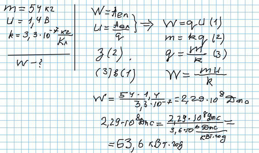 Визнач витрати електроенергії на рафінування 54кг міді, якщо напруга на електродах електролітичної ванни становить 1,4В. (Електролітичне рафінування — електроліз водних розчинів або сольових розплавів, що дозволяє одержувати метали високої чистоти.) Електрохімічний еквівалент міді k=0,33⋅10−6кгКл.