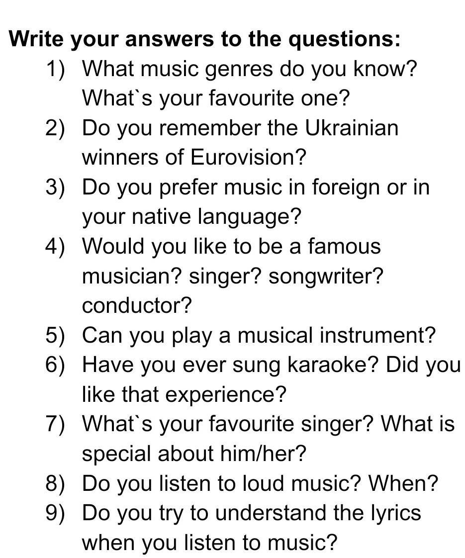 3)I like to listen to Ukrainian songs, usually in English 4)Once upon a time, as a child I wanted to be a singer 5)No, but I wanted to learn 6)Yes, as a child I loved to sing, the first experience in 3 years 7)I don't have the best singer 8)Yes, on the street 9) At first yes, and then I don't sing as is.