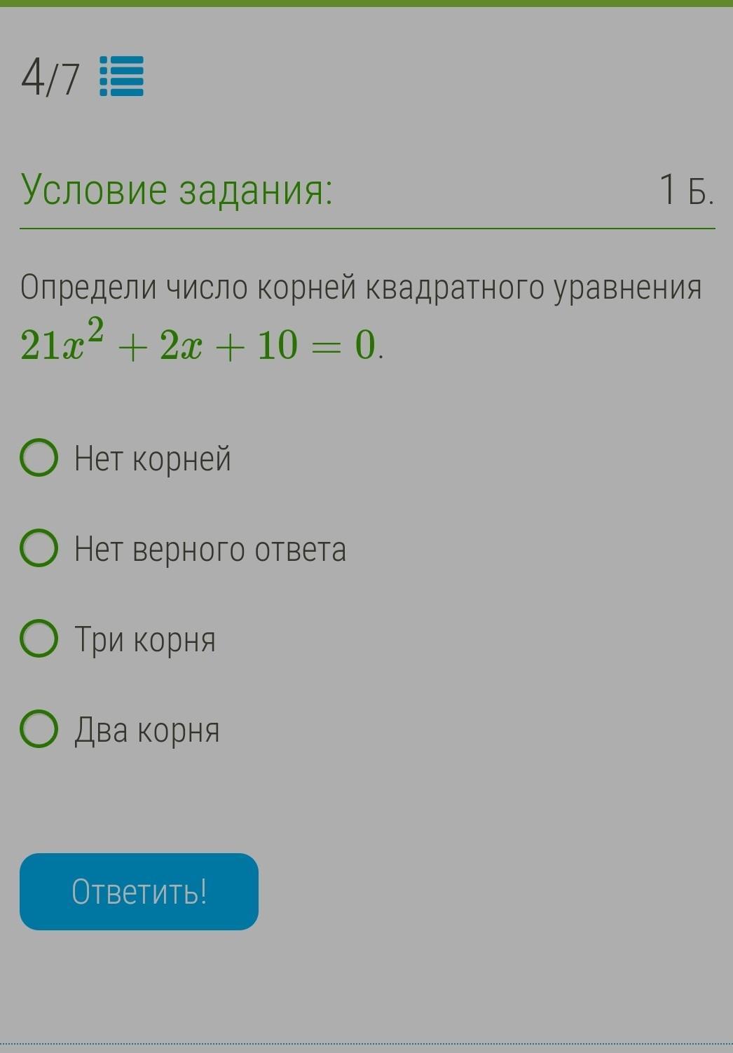 определи число корней квадратного уравнения 21x2+2x+10=0 1) нет корней 2) нет верного ответа 3) три корня 4) два корня