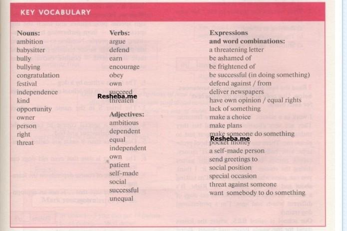 Выражения и словосочетания: угрожающее письмо стыдиться бояться быть успешным (в чем-либо) защищаться от/от доставлять газеты иметь собственное мнение/равные права отсутствие чего-либо делать выбор строить планы заставлять кого-то делать что-то карманное или самостоятельный заставил человека послать приветствие социальному положению особый случай угроза кому-то хотеть, чтобы кто-то сделал что-то