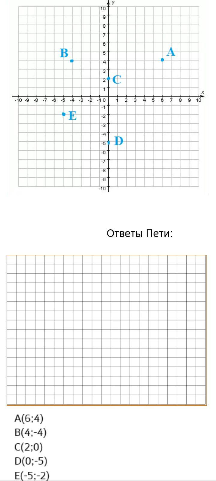Петя выполнил задание по теме: «Координатная плоскость» и собирается отправить его на проверку учителю. Перед этим он решил еще раз убедиться, что сделал все верно. В задании требовалось выписать координаты точек, изображенных на рисунке, все ли верно сделал Петя? Исправь его, если есть ошибки.