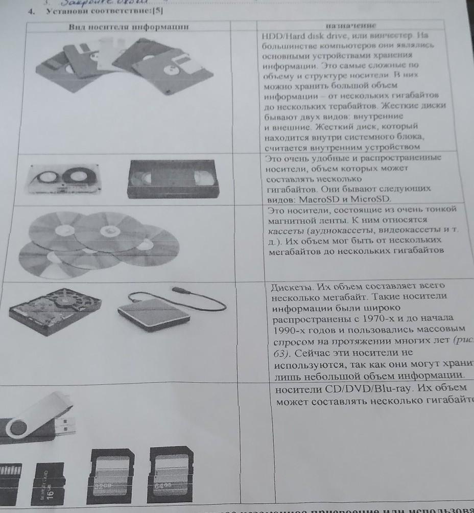 4. Установи соответствие:[5] Вид носителя информации назначение Rob HDD/Hard disk drive, или винчестер. На большинстве компьютеров они являлись основными устройствами хранения информации. Это самые сложные по объему и структуре носители. В них можно хранить большой объем информации — от нескольких гигабайтов до нескольких терабайтов. Жесткие диски бывают двух видов: внутренние и внешние. Жесткий диск, который находится внутри системного блока, считается внутренним устройством Это очень удобные и распространенные носители, объем которых может Составлять несколько гигабайтов. Они бывают следующих видов: MacroSD и MicroSD. Это носители, состоящие из очень тонкой магнитной ленты. К ним относятся кассеты (аудиокассеты, видеокассеты и т. д.). Их объем мог быть от нескольких мегабайтов до нескольких гигабайтов оо да се SH си Дискеты. Их объем составляет всего несколько мегабайт. Такие носители информации были широко распространены с 1970-х и до начала 1990-х годов и пользовались массовым спросом на протяжении многих лет (рис. 3). Сейчас эти носители не используются, так как они могут хранить лишь небольшой объем информации. носители CD/DVD/Blu-ray. Их объем может составлять несколько гигабайтов о 5. .... ............. - это умышленное незаконное присвоение или использование чужого произведения или его части другим человеком. Во избежание плагиата