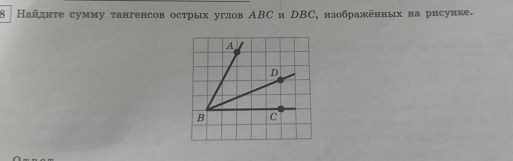 от точки А опускаем перпендикуляр на ВС, получаем прямоугольный треугольник, находим отношение противолежащего катета ( длина перпендикуляра =4) к прилежащему (2 клетки), это тангенс первого угла АВС, он равен 4/2=2, а теперь так же найдем и тангенс второго угла DВС, он равен 2/5=0.4, их сумма 2+0.4=2.4