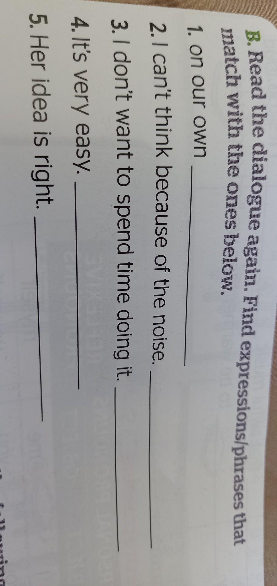 B. Read the dialogue again. Find expressions/phrases that match with the ones below. 1. on our own 2. I can't think because of the noise. 3. I don't want to spend time doing it. 4. It's very easy. 5. Her idea is right.