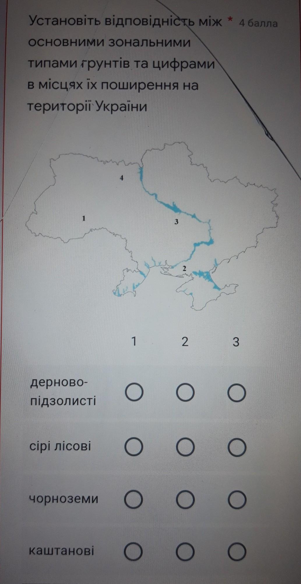 Установіть відповідність між основними зональними типами грунтів та цифрами в місцях їх поширення на території України