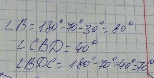 в треугольнике ABC уголы A и C равны 30 и 70 градусов соответственно. Найдите угол BDC, если проведена биссектриса ВД