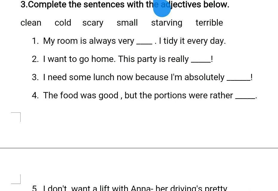 3.Complete the sentences with the adjectives below. clean cold scary small starving terrible
