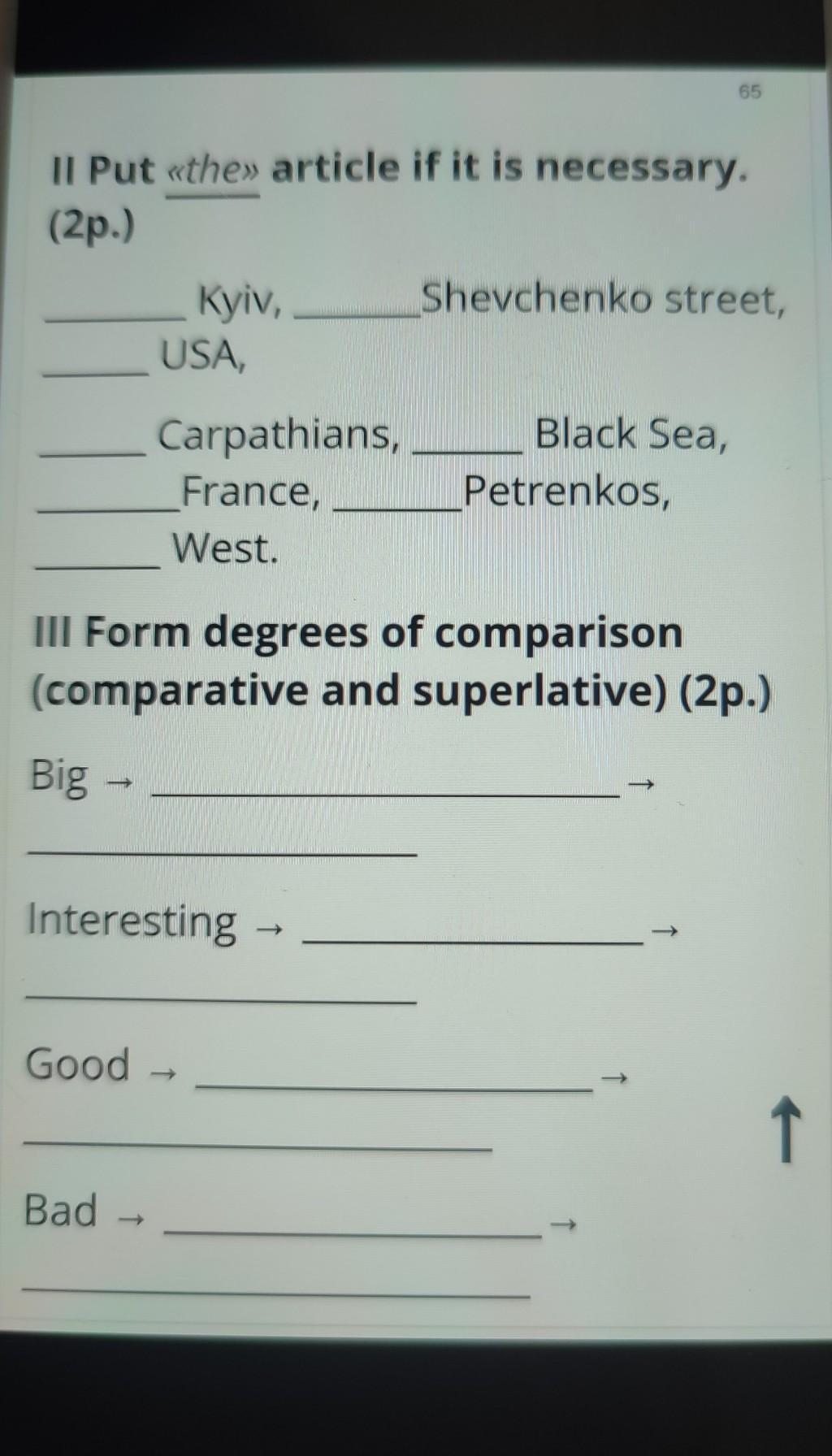 1) the Kiyv, the Shevchenko street, the USA, the CarpathianCarpathians, the Black sea, the France, Petrenkos, the West.
