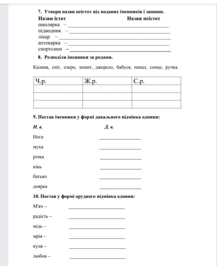 8 - Калина (Ж.р.), сніг (ч.р.), озеро (с.р.), зошит (ч.р.), джерело (с.р.), бабуся (ж.р.), пенал (ч.р.), сонце (с.р.), ручка (ж.р.)