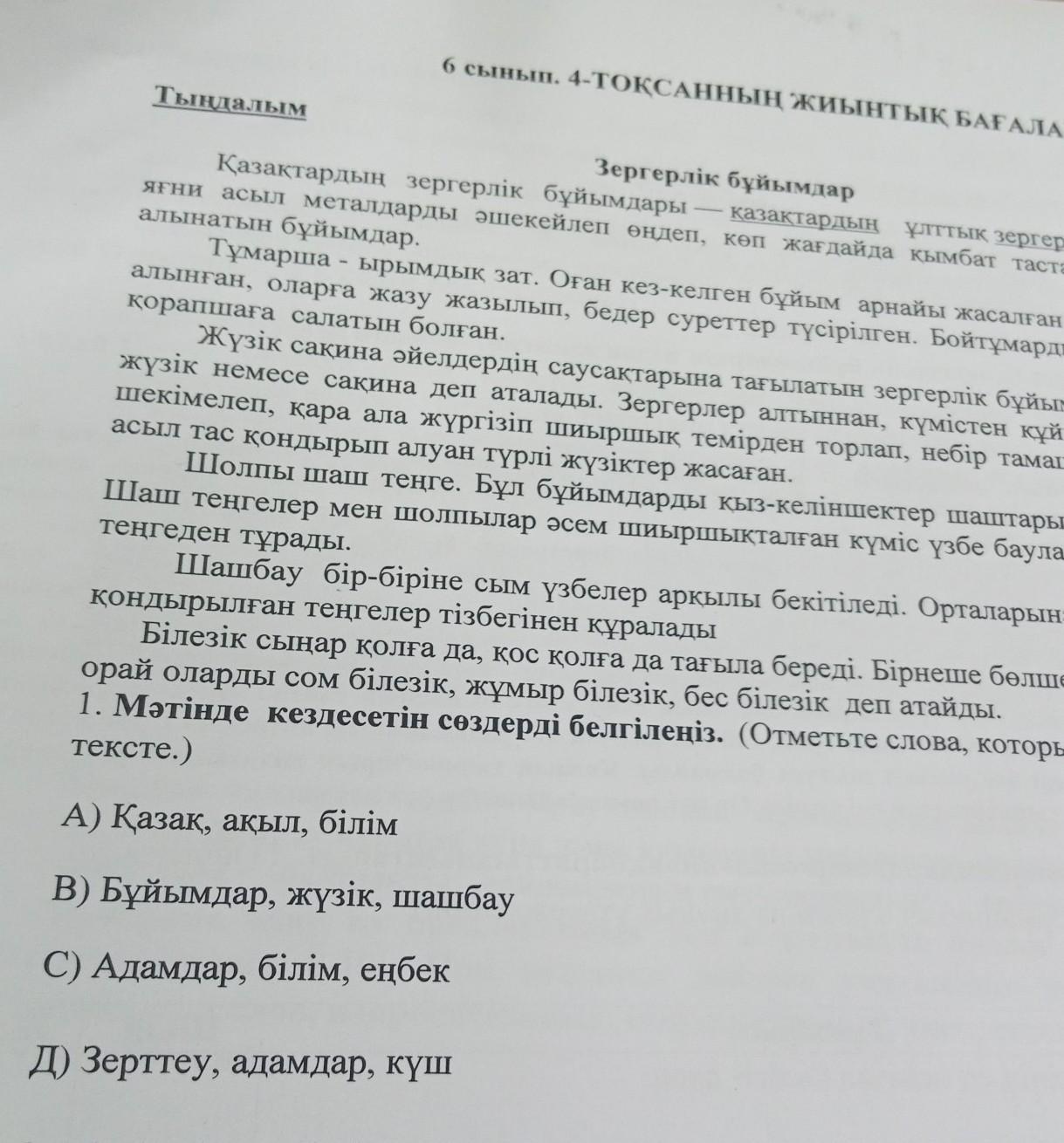 1. Мәтінде кездесетін сөздерді белгілеңіз. (Отметьте слова, которые встре тексте.) A) Қазақ, ақыл, білім В) Бұйымдар, жүзік, шашбау C) Адамдар, білім, еңбек Д) Зерттеу, адамдар, күш