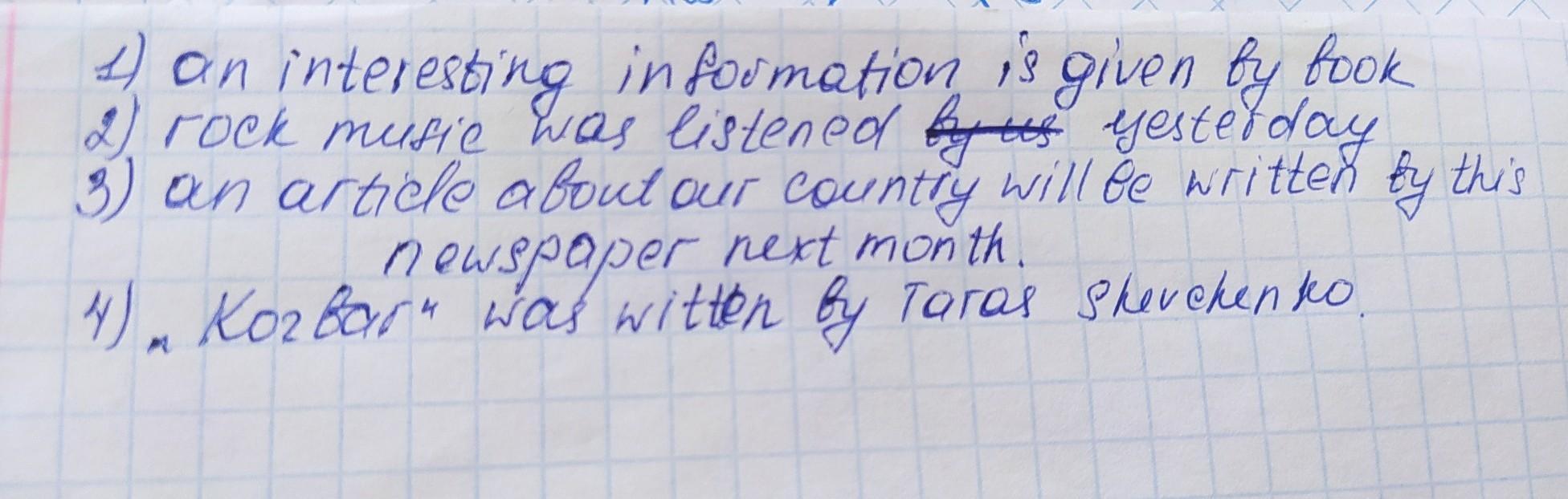 4. Put the sentences into Passive Voice: 1) A book gives an interesting information. (Present Passive) 2) We listened to rock music yesterday. (Past Passive) 3) This newspaper will write an article about our country next month. (Future Passive) 4) Taras Shevchenko wrote "Kobzar". (Past Passive)