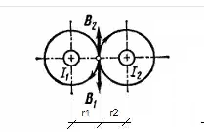 Два паралельні нескінченно довгі прямолінійні провідники , в яких течуть в одному напрямку струми величинами І(1)=І(2)=6А , розміщені на відстані d= 0,1м один від одного. Визначити магнітну індукцію B у точці ,що знаходиться на відстані R(1)=0,05 м від одного провідника і на R(2)=0,05 м від другого