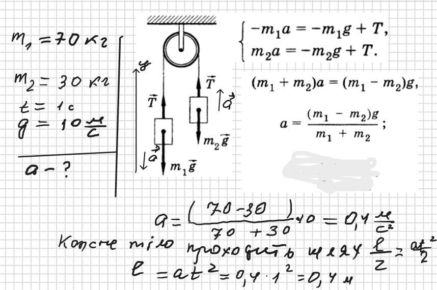 1. Через нерухомий блок перекинута мотузка, на кінцях якої закріплені вантажі масами 30кг та 70