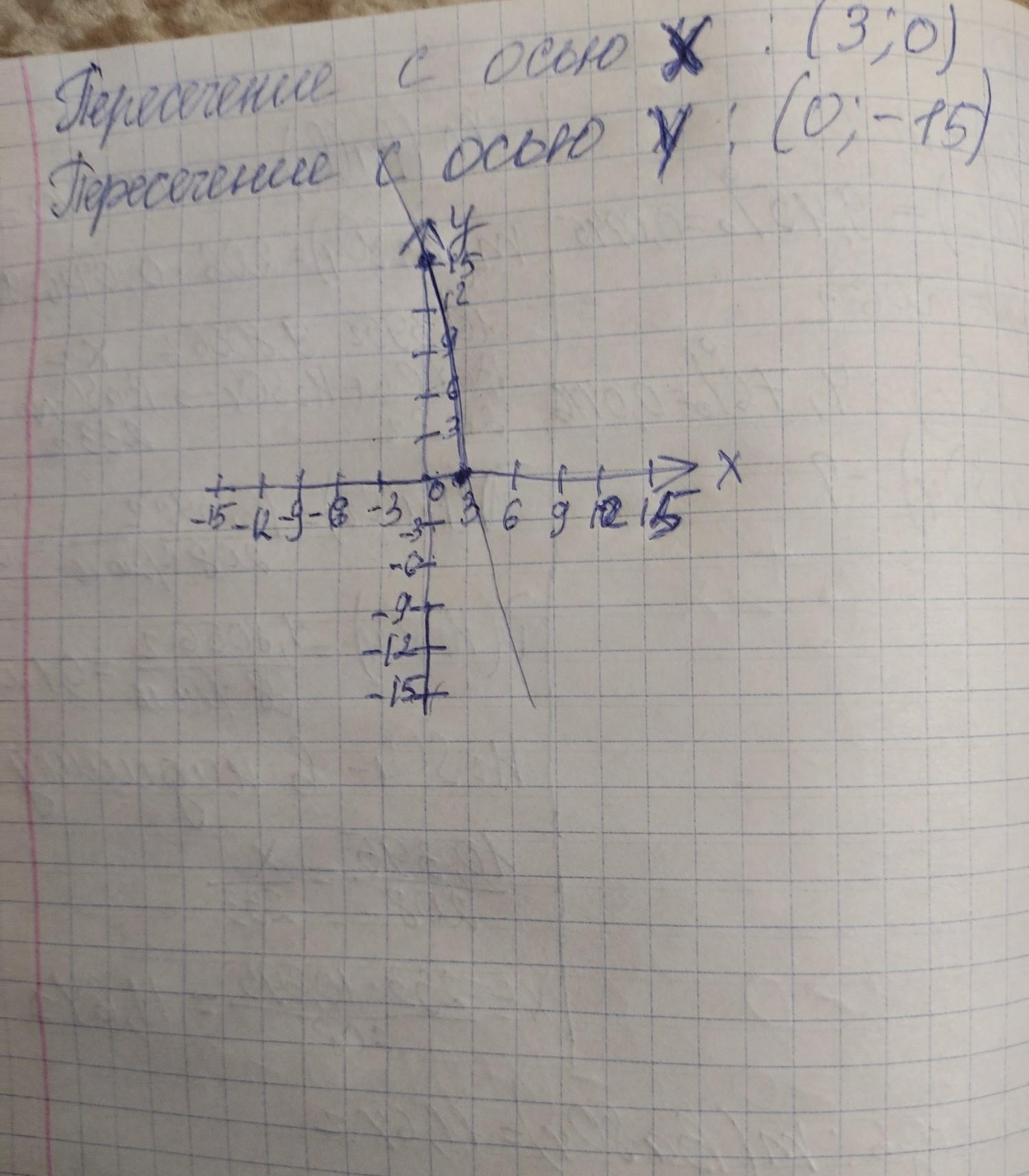 функция задана формулой у=5х-15. Найти координаты точек пересечения с осями координат и создать график функции