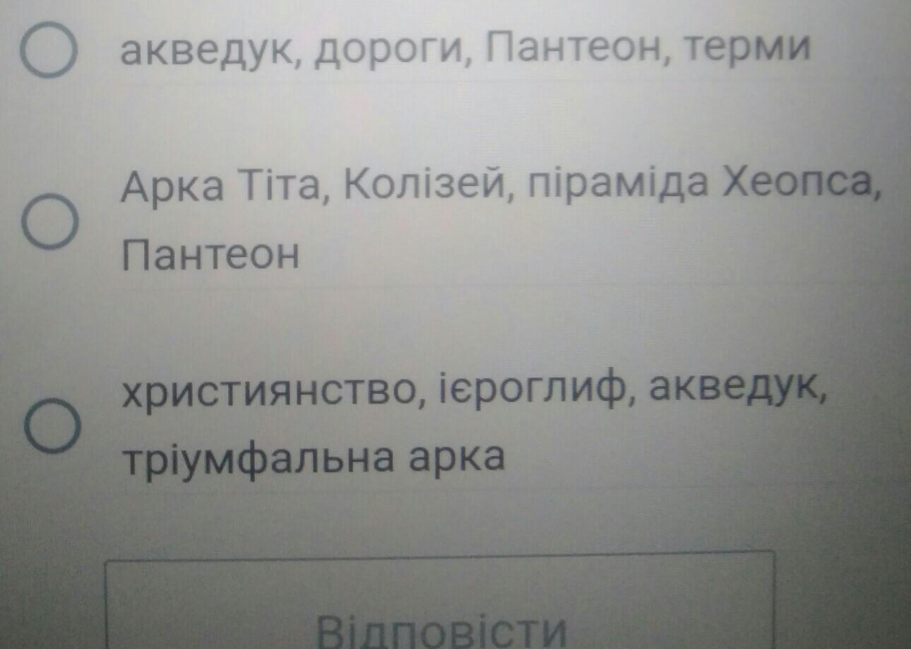 Оберіть рядок, де ВСІ слова мають відношення до культури Риму:
