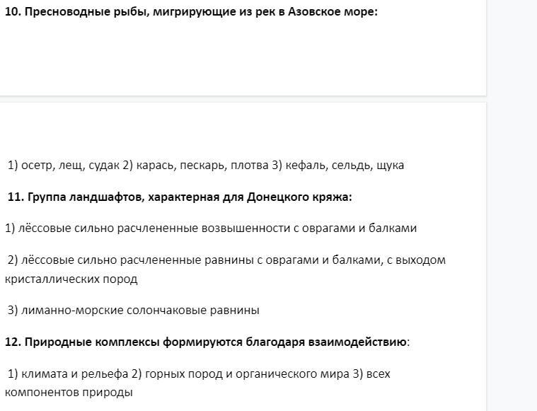 10.2;11.Ответ 2 (Долины глубокие, нередко с выходами коренных пород на склонах. Водоразделы имеют вид слабоволнистых равнин, почти полностью распаханных. Характерная черта рельефа — наличие форм антропогенного происхождения: терриконы, карьеры и другое. Характерной чертой природного ландшафта кряжа являются многочисленные балки, многие из которых, в силу их непригодности для сельского хозяйства, остаются в первозданном виде)12.Ответ 2)