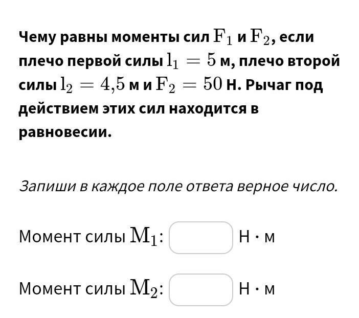 1 2 Чему равны моменты сил F1 и F2, если плечо первой силы 11 5м, плечо второй силы 12 = 4,5ми F2 = 50 Н. Рычаг под действием этих сил находится в равновесии. Запиши в каждое поле ответа верное число. Момент силы М,: H:M Момент силы М.: H:M