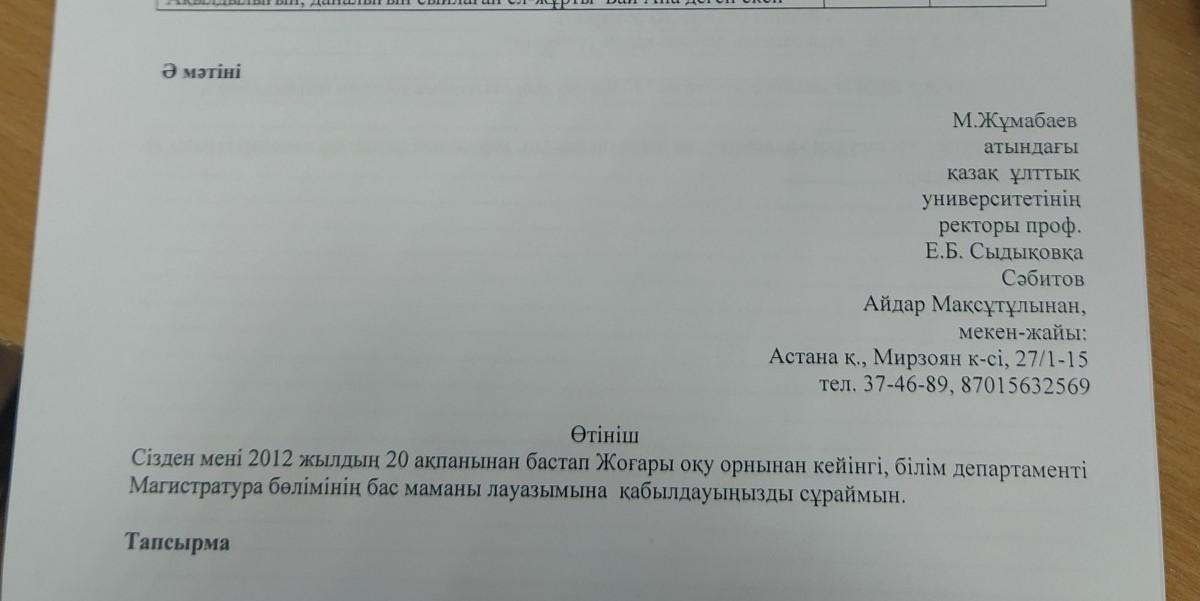 Ә мәтіні М.Жұмабаев атындағы қазақ ұлттық университетінің ректоры проф. Е.Б. Сыдықовқа Сәбитов Айдар Мақсұтұлынан, мекен-жайы: Астана қ., Мирзоян к-сі, 27/1-15 тел. 37-46-89, 87015632569 Өтініш Сізден мені 2012 жылдың 20 ақпанынан бастап Жоғары оқу орнынан кейінгі, білім департаменті Магистратура бөлімінің бас маманы лауазымына қабылдауыңызды сұраймын. Тапсырма