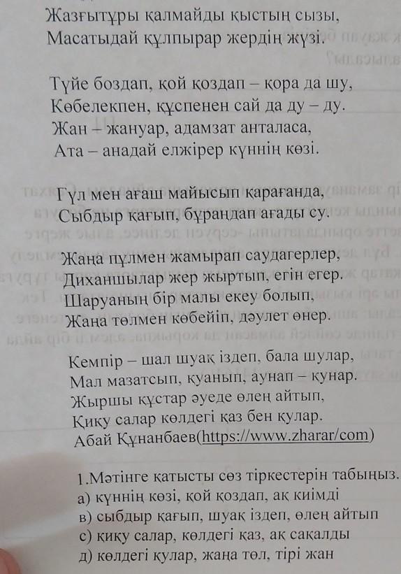 1.Мәтінге қатысты сөз тіркестерін табыңыз. Ол а) күннің көзі, қой қоздап, ақ киімді в) сыбдыр қағып, шуақ іздеп, өлең айтып с) қиқу салар, көлдегі қаз, ақ сақалды д) көлдегі қулар, жаңа төл, тірі жан