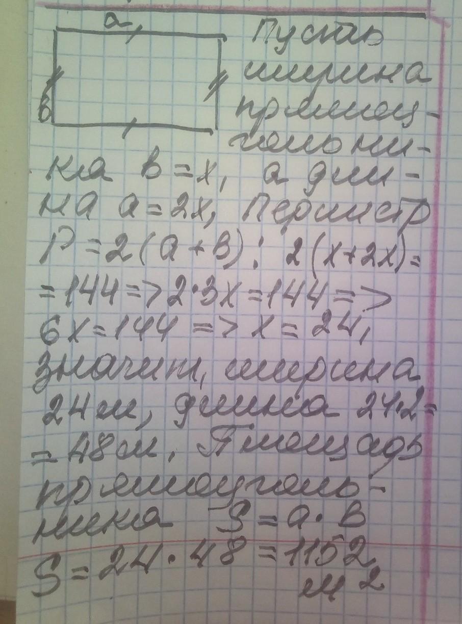 довжина пямокутника в двічі більша ніж ширина.Периметр прямокутника дорівнює 144м. знайдіть довжину і ширину прямокутника. обчисліть площу.це потрібно скласти рівняння