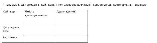 1-тапсырма. Шығармадағы кейіпкердің тұлғалық ерекшеліктерін концептуалды кесте арқылы талдаңыз Кейіпкер Адами қасиеті Өмірге қызығушылығы Қыздардың әкесі Ая, Райхан