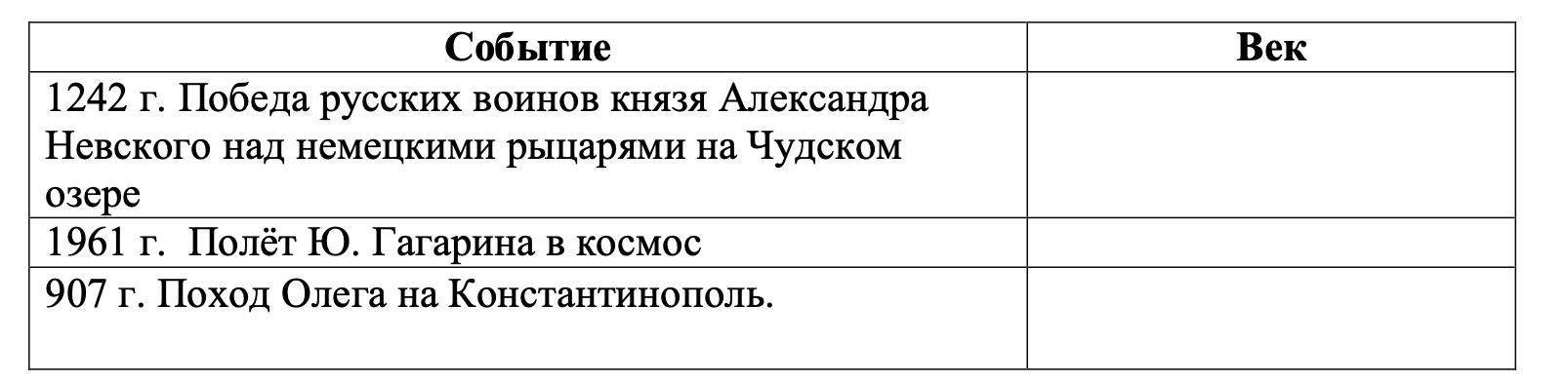 Определи, в каком веке произошли эти события. Заполни таблицу. Название века записывай римскими цифрами.