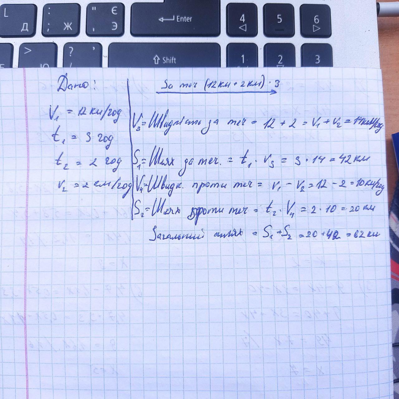 Човен власна швидкість якого дорівнює 12 км/год,він проплив 3години за тичією і 2години проти тичиї річкі. Яку відстань подолав човен за цей час якщо швидкість течії 2 км/год