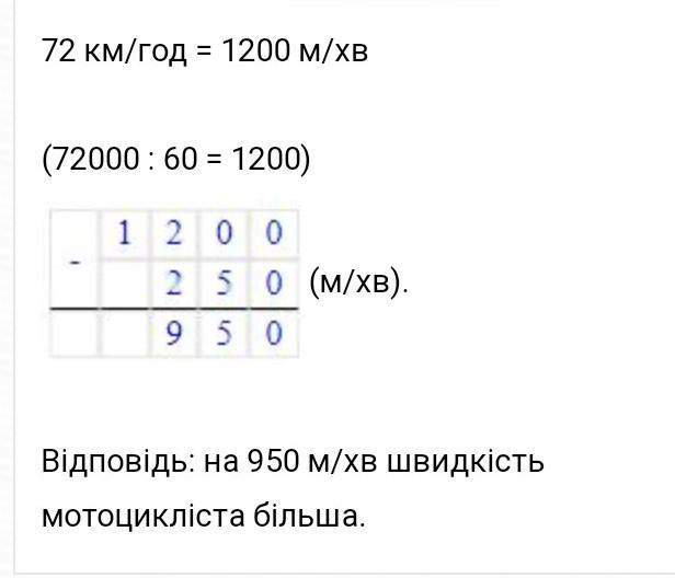 Задача Мотоцикліст рухається зі швидкістю 72 км/ год, а велосипедист - зі швидкістю 250 м/хв. У кого з них швидкість більша? На скільки метрів за хвилину більша?