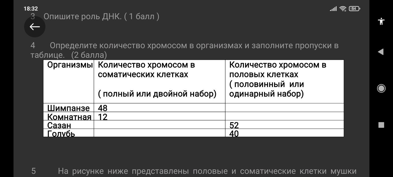 4 Определите количество хромосом в организмах и заполните пропуски в таблице. (2 балла)