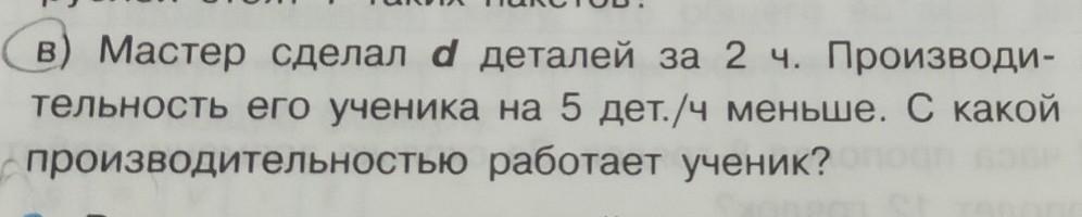 в) Мастер сделал о деталей за 2 ч. Производи тельность его ученика на 5 AeT./4 меньше. С какой производительностью работает ученик?