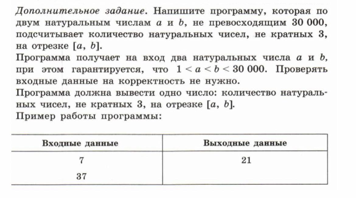 Напишите программу, которая по двум натуральным числам а и b, не превосходящим 30 000, подсчитывает количество натуральных чисел, не кратных 3, на отрезке [a, b]. Программа получает на вход два натуральных числа а и b, при этом гарантируется, что 1 < a < b < 30 000. Проверять входные данные на корректность не нужно. Пр Программа должна вывести одно число: количество натуральных чисел, не кратных 3, на отрезке [а, b]. Пример работы программы: