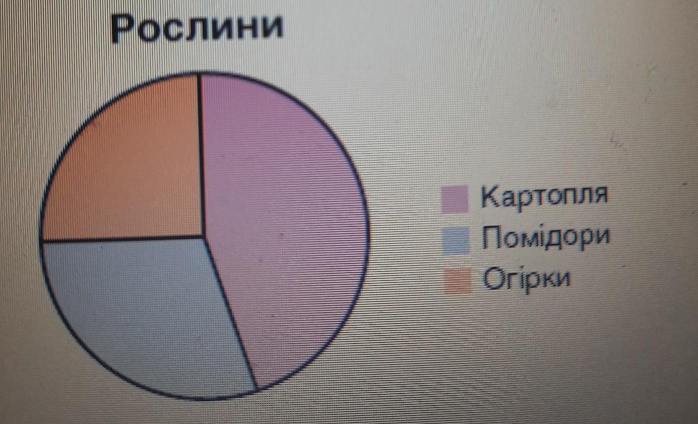 на круговій діаграмі зображено яку частину ділянки займає кожна рослина картопля,помідори й огірки Обчисли ,скільки відсотків займають ці рослини окремо.