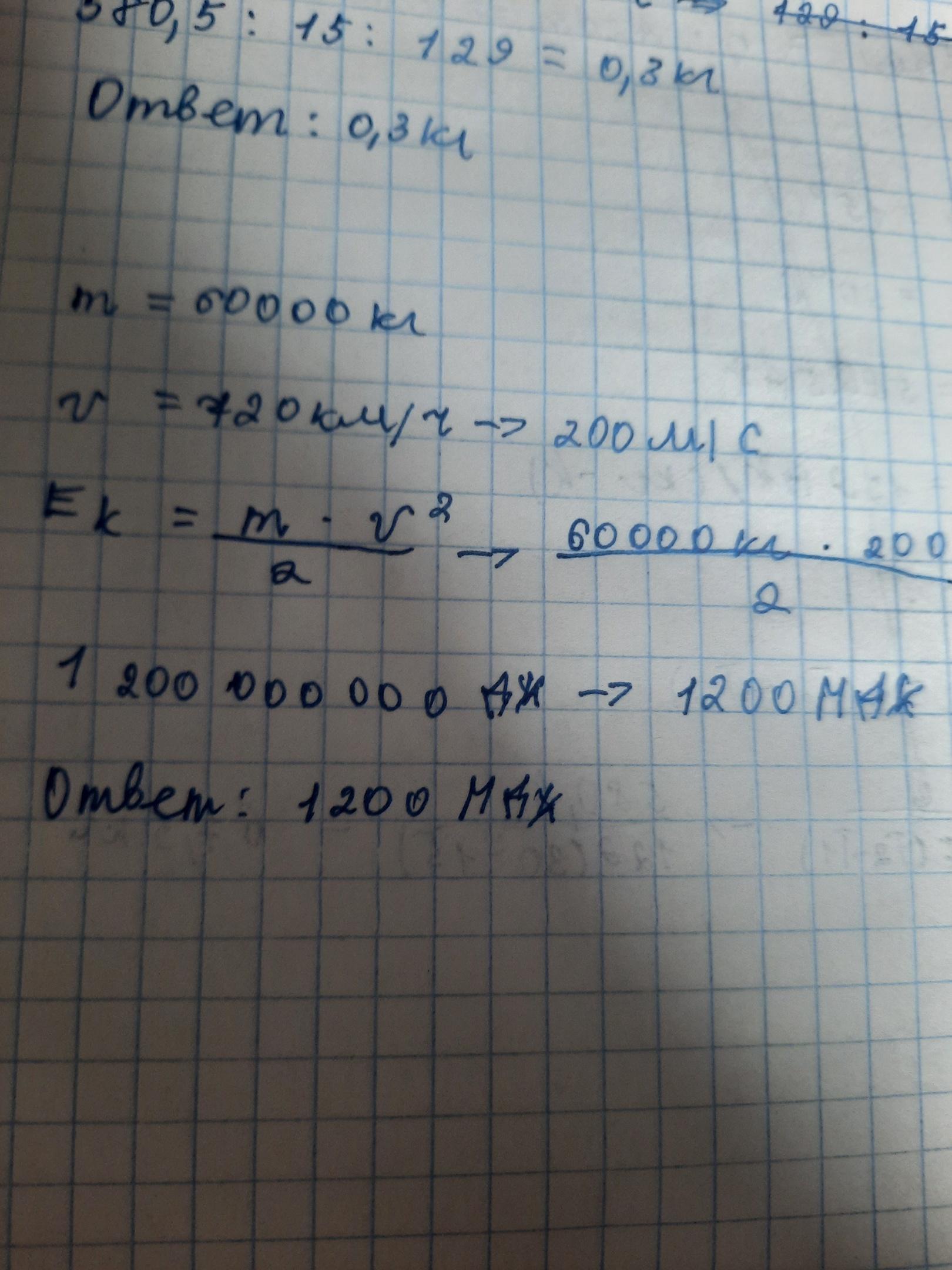 Самолет массой 60000 кг летит на высоте 12000м со скоростью 720 км/ч. Вычислите кинетическую энергию, которой обладает самолет.