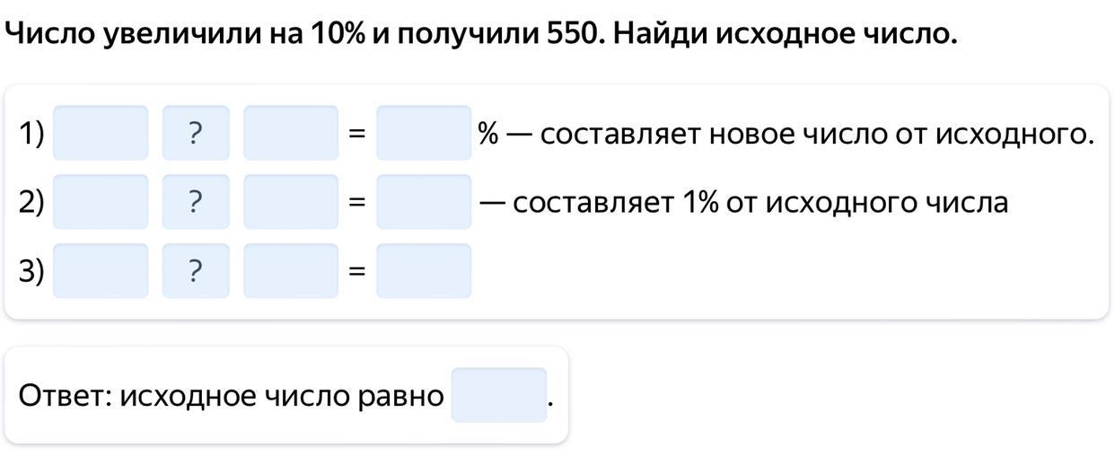 1) 100%+10%=110% - составляет новое число от исходного. 2) 550:110%=5 - составляет 1% от исходного числа. 3) 5•100%=500.