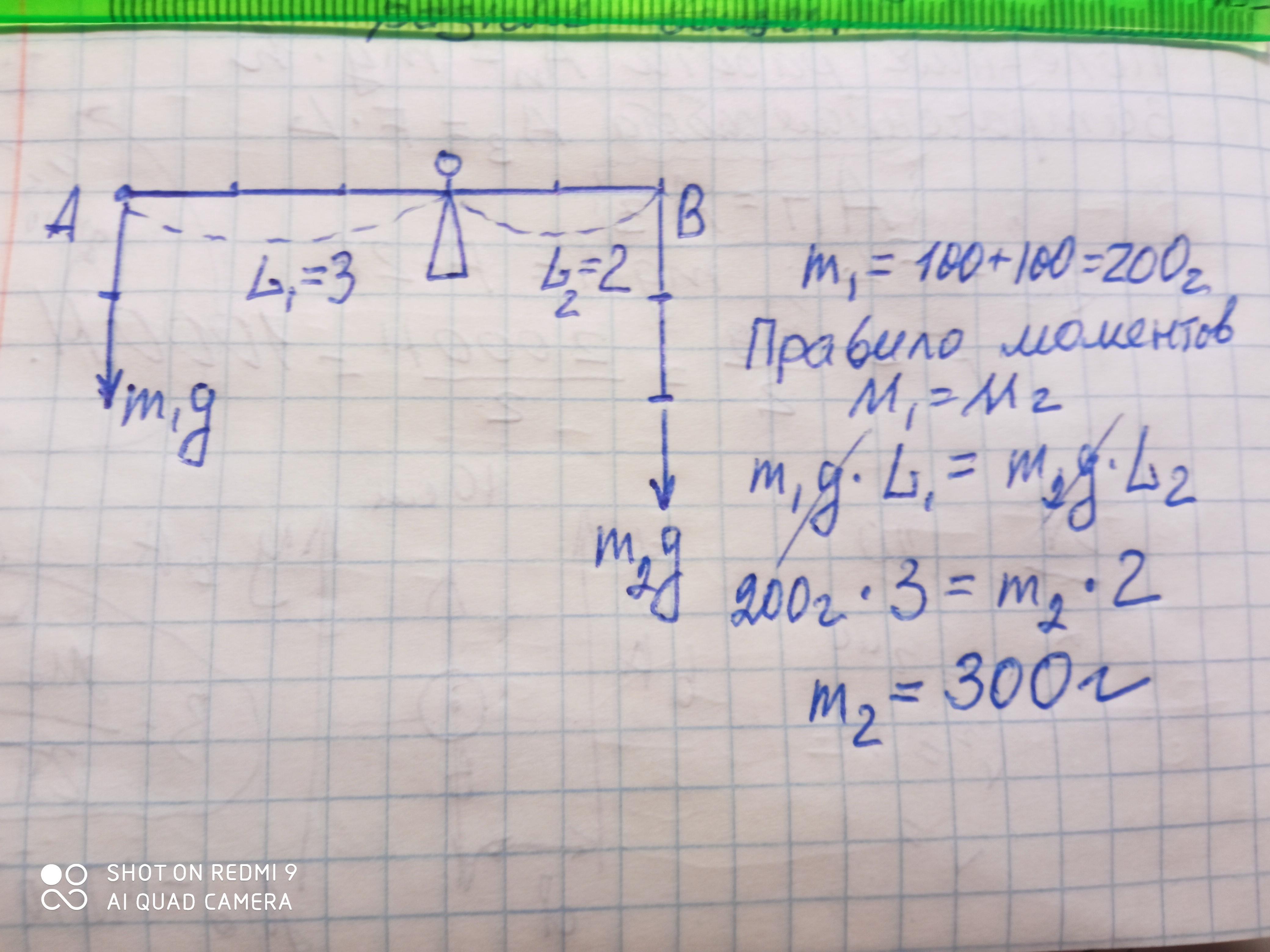 На малюнку зображений важіль, що має вісь обертання в точці О. Вантаж якої маси потрібно підвісити в точці В, щоб важіль перебував у рівновазі? (2 бали)