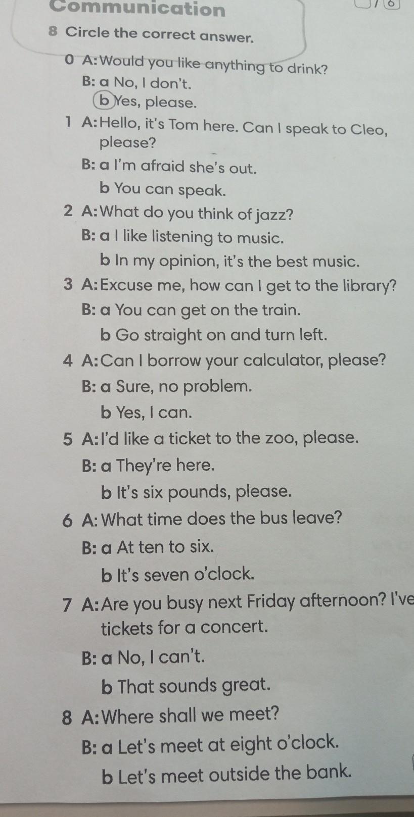 u Communication 8 Circle the correct answer. O A:Would you like anything to drink? B: a No, I don't. b Yes, please. 1 A:Hello, it's Tom here. Can I speak to Cleo, please? B: a I'm afraid she's out. b You can speak. 2 A:What do you think of jazz? A B: a I like listening to music. b In my opinion, it's the best music. 3 A:Excuse me, how can I get to the library? B: a You can get on the train. b Go straight on and turn left. 4 A:Can I borrow your calculator, please? B: a Sure, no problem. b Yes, I can. 5 A:I'd like a ticket to the zoo, please. B: a They're here. b It's six pounds, please. 6 A: What time does the bus leave? B: a At ten to six. b It's seven o'clock. 7 A:Are you busy next Friday afternoon? I've got tickets for a concert. B: a No, I can't. b That sounds great. 8 A:Where shall we meet? B: a Let's meet at eight o'clock. 0/8 b Let's meet outside the bank.