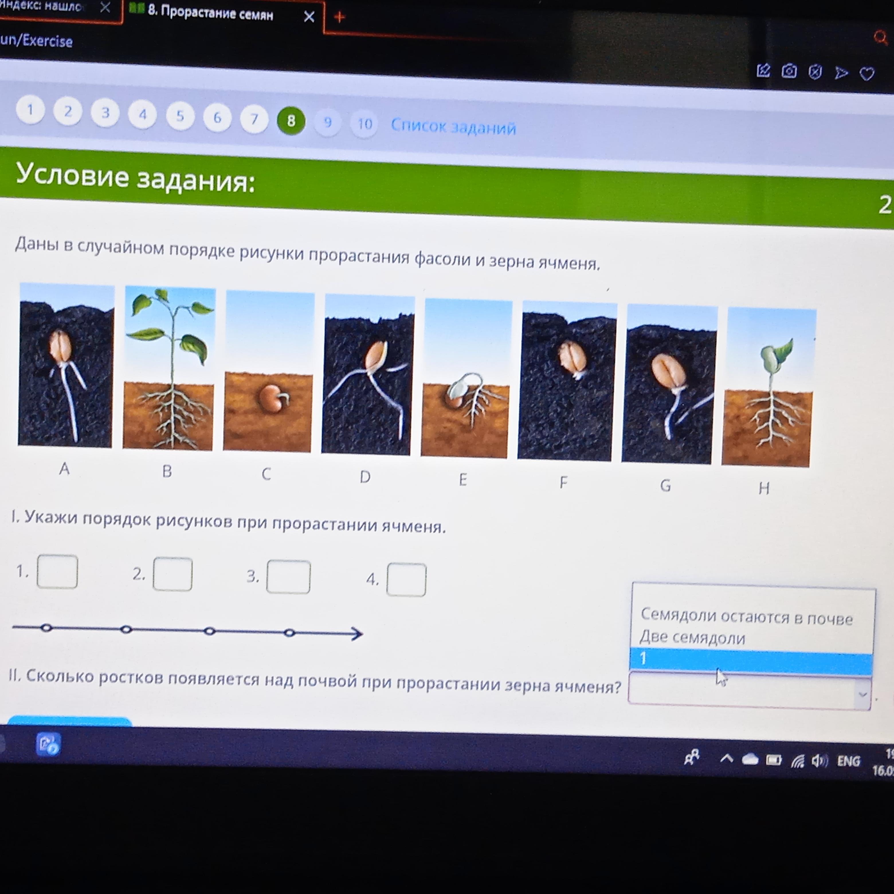 Даны в случайном порядке рисунки прорастания фасоли и зерна ячменя